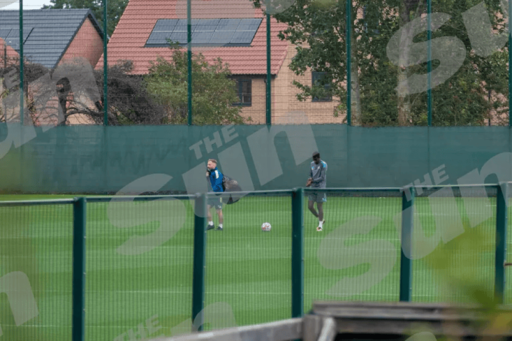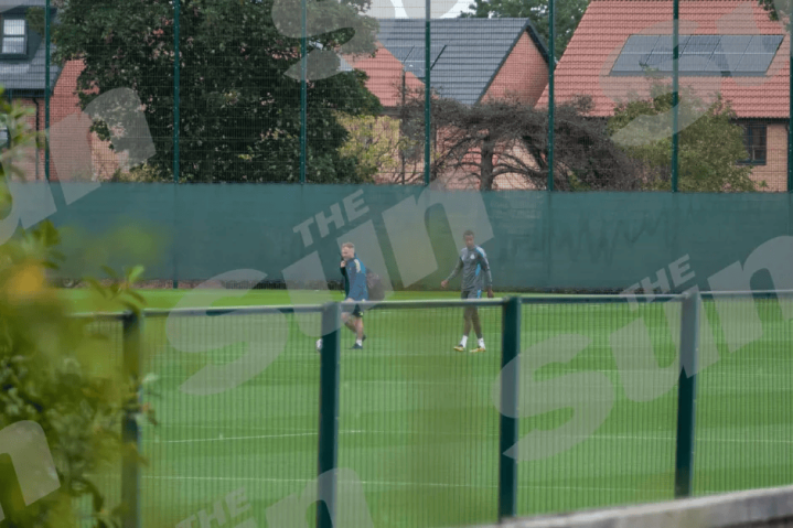 一名工作人员提着一袋球,被拍到在草地上与这位身着纽卡斯尔训练服的球员一起训练,他看起来闷闷不乐。